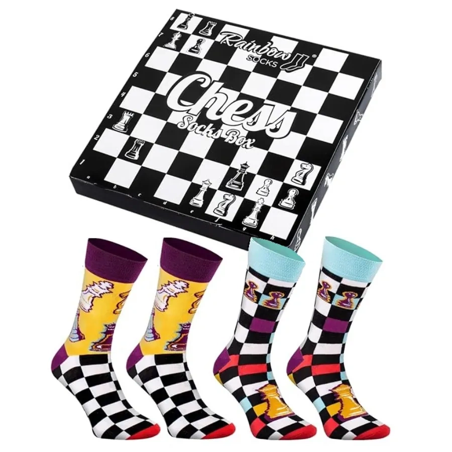 Fani szachów to w dużej mierze miłośnicy klasyki. Właśnie dla nich stworzyliśmy kolorowe skarpetki szachy, czyli 2 pary skarpetek na prezent. Na jednej z nich na stopach znajduje się szachownica, a nieco wyżej – pionki. Druga para jest w całości w czarno-białą szachownicę, a na stopach dodatkowo znalazły się król lub królowa. Tradycyjny biało-czarny wzór przełamaliśmy nutką koloru - tak jak zawsze na skarpetkach na prezent od Rainbow Socks.